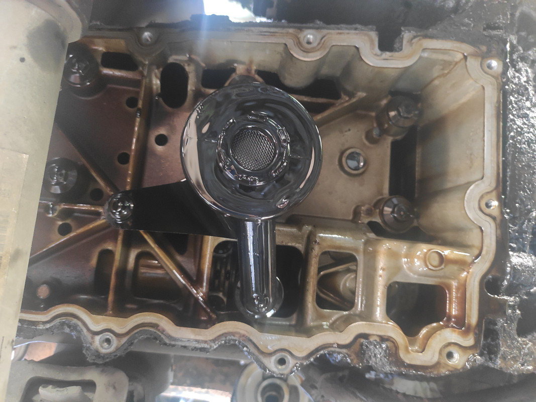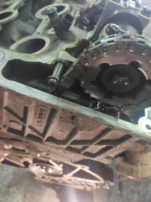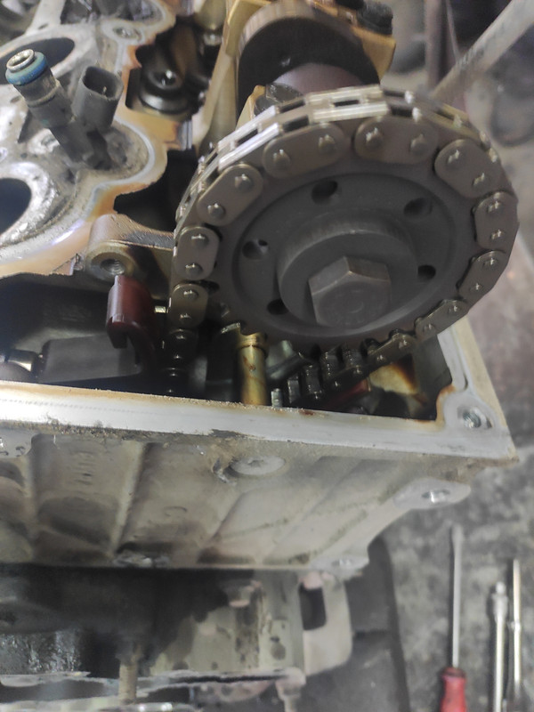 По итогам первого беглого осмотра - совсем нет успокоителя на задней цепи, заклиненный маслонасос - в нем какая-то стружка, привод маслонасоса тоже приказал долго жить... шатуны 5 и 6 цилиндра похоже потянуло, после их ослабления колено закрутилось. Задняя цепь поелозила по болту, видимо на котором успокоитель крепился. Пока так.