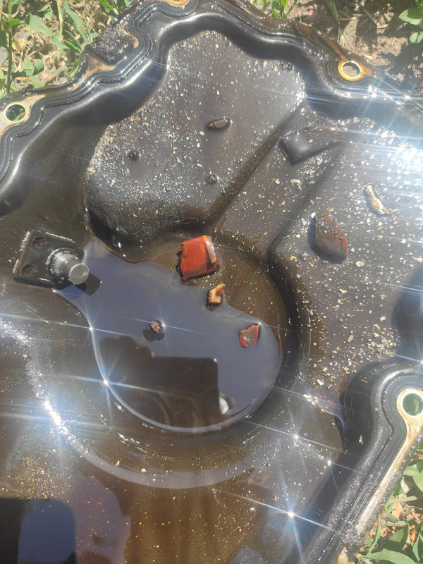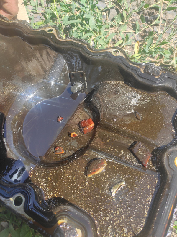 Наконец дошли руки до бегемота. Первые результаты вскрытия. Интересный набор в поддоне. Развалился успокоитель цепи. Но теперь снизу я больше ничего не вижу. Снятие крышки поддона особых результатов не дали. Толи теперь сверху разбирать, толи попробовать дальше снизу? Думаю нижнюю часть блока можно попробовать отвинтить. Пока также непонятна причина клина - толи под цепь попал успокоитель, толи всё же прихватило шатун.